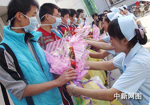 圖為醫(yī)院醫(yī)護(hù)人員向?qū)W生們獻(xiàn)花祝賀康復(fù)出院。作 者:周秀光