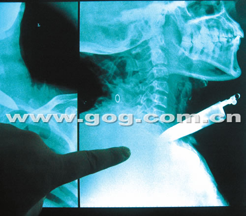 貴醫(yī)附院耳鼻喉科主治醫(yī)生王曉云告訴記者,老人被送到醫(yī)院時,喉嚨上插著一把水果刀,進入喉嚨的刀鋒部分大約有6.5公分。王曉云說:“經(jīng)檢查,老人頸部和肺尖受傷,生命垂危。由于水果刀可能傷到大動脈,手術有風險,要求家屬簽字,但老人一直不透露家人的信息,我們醫(yī)院也很為難。”