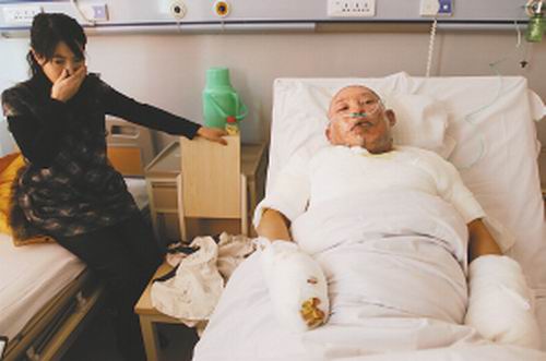 昨日,記者在吉林省武警醫(yī)院見到了來自公主嶺市陶家屯鎮(zhèn)久勝村6社41歲的劉國軍。他的頭部、面部都抹滿了藥膏,上半身及雙手都裹著厚厚的紗布,好在還神志清醒。