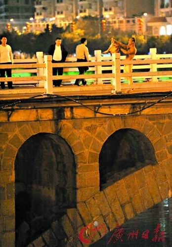 前晚,記者在事發(fā)現(xiàn)場(chǎng)看到,一個(gè)上身赤裸的男子情緒十分激動(dòng),一手“提”著小孩的腳,一手揮舞水果刀,站在橋欄旁將小孩甩來甩去,并時(shí)而將小孩“伸”出橋欄外,F(xiàn)場(chǎng)民警一邊與持刀男子展開對(duì)話,勸說其不要傷害小孩,一邊派熟悉水性的民警駕船到新豐江河中,以防萬一。20多分鐘后,經(jīng)當(dāng)?shù)孛窬托膭裾f,該男子終于扔掉手中的水果刀,民警迅速包圍該男子將其擒住。(曾煥陽(yáng) 李燕南 黃贊福)