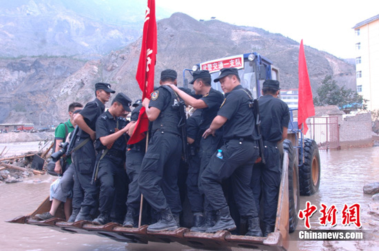 8月8日下午15時,成都公安特警集結(jié)150人的隊伍從成綿高速成都入口處出發(fā),以摩托化開進的方式,途經(jīng)成綿高速、綿廣高速出廣元昭化出口,上122國道經(jīng)青川、甘肅文縣、隴南市,經(jīng)過800公里連續(xù)18個小時的不間斷長途跋涉,首批隊伍共計80人于9日上午8時15分到達災區(qū)舟曲縣城。第二批隊伍于9日15時許到達舟曲。