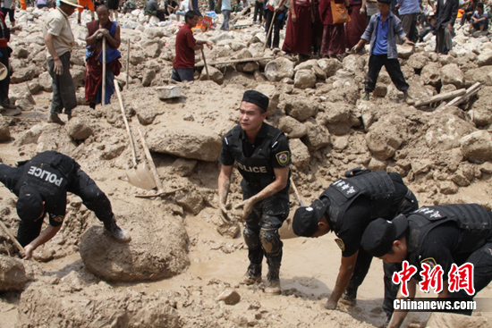 中新網(wǎng)舟曲8月9日電(劉賢 徐楊祎)成都公安特警兩批共150名救援官兵于9日先后到達甘肅舟曲災區(qū)。救援官兵組織的35人青年突擊隊已協(xié)助武警和當?shù)孛癖瘸?名遇困群眾,挖出兩具遇難群眾遺體。