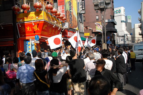 午后1點左右,大概有30人左右自稱前去為池袋做街道清掃,集結(jié)到池袋電車站北口附近的“陽光城”中國物產(chǎn)店門前。這群人手舉著日本國旗,對“陽光城”進(jìn)行游行抗議。