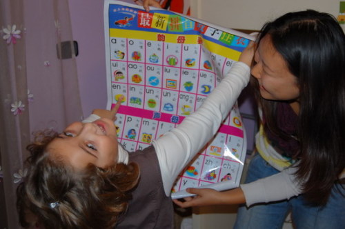 11月初我受邀來到馬爾蒂娜家里時(shí),她正在寫作業(yè),我在門外就聽到她嘴里還叨咕著乘法口訣。她做完了作業(yè),我問她用筷子技巧是否有進(jìn)步,她拉著我到廚房表演起來。為了表示對她進(jìn)步的肯定和鼓勵(lì),我送給她一本《漢語拼音趣味圖案冊》,并告訴她可以按照這些生動(dòng)有趣的拼音圖案開始正式學(xué)習(xí)漢語。她手捧著禮物,深深地回送給我一個(gè)吻,這是意大利最傳統(tǒng)的表示問候或感謝的禮儀。