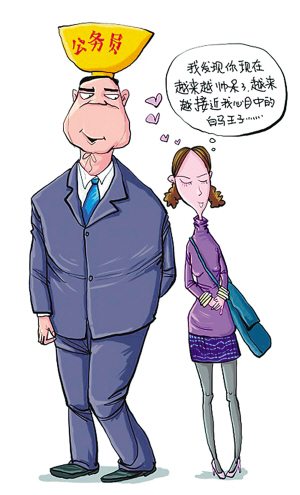 “嫁個(gè)公務(wù)員,就像買(mǎi)了一只潛力股。沒(méi)漲的時(shí)候,收入穩(wěn)定,有福利保障,一旦升遷,隨著職場(chǎng)地位的提高,帶來(lái)的精神和物質(zhì)上的附加值是不可估量的!贝髮W(xué)畢業(yè)3年,在一家設(shè)計(jì)公司任職的黃露是一名資深“嫁碗族”,在她馬不停蹄的相親路上,對(duì)公務(wù)員總是大開(kāi)綠燈,“一聽(tīng)說(shuō)是公務(wù)員,好感會(huì)直線(xiàn)上升!