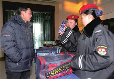 據(jù)北京站公安段的民警介紹,雖然目前進站購票、乘車的旅客并未達到高峰,但為保證安全,凡進入北京站進站大廳及售票大廳的旅客都要接受安檢員的檢查。