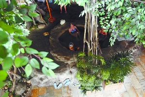 溫泉養(yǎng)生區(qū)的山石、樹(shù)根、藤蔓營(yíng)造出熱帶雨林的幽雅環(huán)境,其中不乏藥池以及石質(zhì)的按摩床,同時(shí),還引入了死海漂浮、親親魚(yú)療等自費(fèi)項(xiàng)目。泡乏了,可以到二樓享受按摩、足療等服務(wù)。