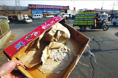 昨天下午,記者見(jiàn)到了這種紙箱。在箱子底部,貼有一張黃色草紙,摸起來(lái)凹凸不平。拿刀子割開(kāi)草紙發(fā)現(xiàn),紙箱底部沾著一層“膩?zhàn)语灐,直徑約一尺,厚約3毫米,尚未完全干透。記者從市場(chǎng)內(nèi)找了一臺(tái)電子秤測(cè)量,這個(gè)特殊的箱子質(zhì)量有2斤1兩,而與之相同的一般紙箱不到一斤。