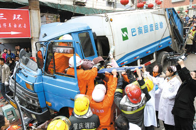 事故后不久,消防官兵和交警先后趕到現(xiàn)場。運(yùn)渣車車頭嚴(yán)重變形,消防員迅速用破拆工具救出了環(huán)衛(wèi)工人張先陽和李國華,但營救最后一個(gè)被卡環(huán)衛(wèi)工尹修正時(shí)遇上困難。尹修正的腿已經(jīng)從變形車門的裂縫中伸出車外,因其全身被卡,消防無法實(shí)施協(xié)助救援,硬拉又怕其難忍疼痛,他們只有一點(diǎn)一點(diǎn)地邊擴(kuò)張、邊移動(dòng),最后又因空間狹窄,只得用起重機(jī)將運(yùn)渣車向后拖移了20厘米,1個(gè)半小時(shí)才將尹修正救出。隨后,他被緊急送往新橋醫(yī)院。據(jù)了解,傷者全都脫離生命危險(xiǎn)。中午12點(diǎn)半,運(yùn)渣車最終被運(yùn)走。此次救援工作耗時(shí)4個(gè)小時(shí)。