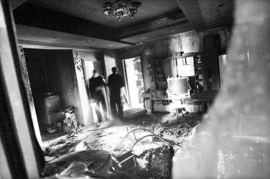 昨日上午9時(shí)30分許,記者在火災(zāi)現(xiàn)場(chǎng)看到,房屋客廳內(nèi)一片狼籍,地板、沙發(fā)、電視機(jī)等都被燒毀,窗戶被撬開,墻壁都被熏黑了,門前有一個(gè)使用過(guò)的滅火器。 民警、消防人員正在勘查現(xiàn)場(chǎng)。
