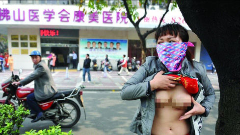 7日上午,趙女士站在廣東省佛山市康美醫(yī)院前的綠化帶中,身披條幅,敲擊銅鈸,一度撩起上衣,露出變形的雙乳,引來(lái)大批人群。趙女士稱3個(gè)多月前于康美醫(yī)院隆乳,術(shù)后雙乳變形,欲索賠8萬(wàn)余元?得泪t(yī)院則稱手術(shù)不理想是她個(gè)人體質(zhì)所致。