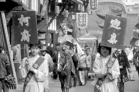 上午9時許,在震天的鑼鼓聲中,33歲的新郎Nicholas(中文名柯家樺)騎著一匹高頭大馬,帶著迎親隊(duì)伍由資中鼓樓壩廣場出發(fā),浩浩蕩蕩地前往當(dāng)?shù)赜忻奈幕袍E文廟。馬背上的新郎羽扇綸巾,而新娘則端坐在花轎中,前有“媒婆”和“丫鬟”帶路?h城少有如此特殊的迎親隊(duì)伍,加之新郎是一個膚色白皙的老外,沿途引得不少群眾駐足。