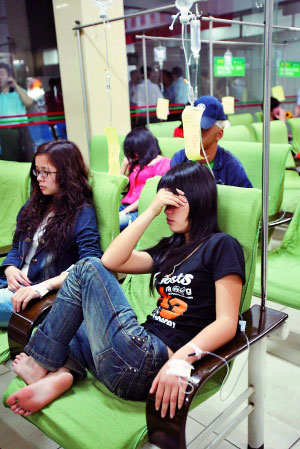 昨日晚上20時(shí),記者來(lái)到天河區(qū)武警醫(yī)院急診科,出現(xiàn)癥狀的病人正在集體治療之中。記者在現(xiàn)場(chǎng)看到,很多人正在一邊輸液、一邊嘔吐。據(jù)院方消息,送來(lái)治療的14人有12人出現(xiàn)明顯癥狀,大多數(shù)為嘔吐、腹瀉、頭暈,一人出現(xiàn)心悸和心慌癥狀,同時(shí)一人還出現(xiàn)輕度手抖,目前經(jīng)過(guò)治療,癥狀已經(jīng)全部緩解,初步懷疑是食物中毒。目前患者嘔吐物和尿液已經(jīng)送往廣州市疾控中心化驗(yàn),截至記者發(fā)稿時(shí)止,化驗(yàn)結(jié)果還未出來(lái)。