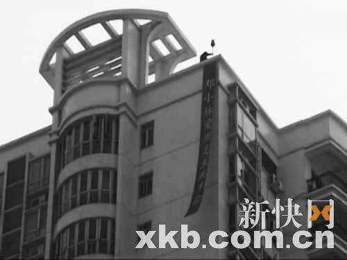 他背后的外墻掛著一條六七米長的紅色條幅,上寫“鄧××愛周×至死不渝”字樣。多名警察在該男子前進行勸說,消防員在樓下鋪設了2米多高的氣墊。近百名市民站在小區(qū)外面的馬路上圍觀,不少市民還大聲規(guī)勸該男子“想開點”。