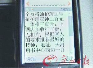 記者試著撥通了其中一間名為廣州某男士SPA會(huì)所的電話(huà),他們主要提供“一條龍”上門(mén)服務(wù),廣州地區(qū)內(nèi)加收來(lái)回車(chē)費(fèi),服務(wù)人員稱(chēng),他們是廣州所有同行里面做得最專(zhuān)業(yè)和時(shí)間最長(zhǎng)的店鋪。
