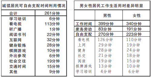 近期美國、日本等9個發(fā)達國家調(diào)查數(shù)據(jù)表明,男性平均可以自由支配時間為5小時6分鐘,女性為4小時43分鐘,分別高于北京市居民46分鐘和60分鐘。
