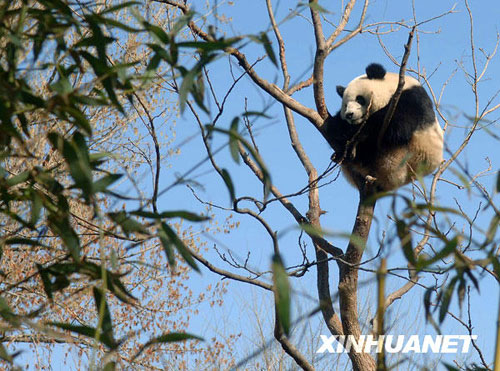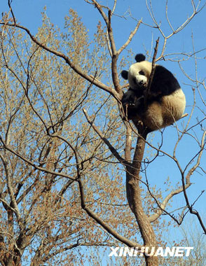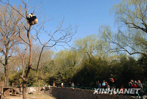 3月22日,北京動物園熊貓館的一只熊貓爬到高高的樹上,它憨態(tài)可掬的模樣吸引了很多參觀者駐足觀看。(新華社記者 公磊 攝)