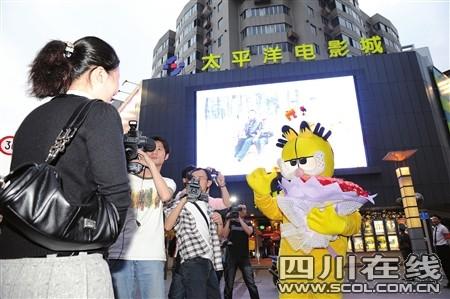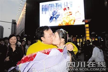 昨晚7點(diǎn),應(yīng)男友的邀請,鄭小姐來到成都春熙路商圈的青年路太平洋影城準(zhǔn)備和男友一起看電影。剛走到影城門口,鄭小姐突然發(fā)現(xiàn):影城門口的大屏幕上,居然正在播放由自己和男友平時照片所組成的短片。沒等鄭小姐回過神來,身穿加菲貓?jiān)煨头b的男友周先生已捧著大束玫瑰走上前來,單膝跪地:“嫁給我吧!