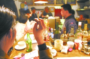 記者來到回龍觀一家名為久千人東北菜的飯店,一進(jìn)門就發(fā)現(xiàn)了全店唯一一張“冒煙兒”的桌子!芭錾侠蠠熋,我們也沒轍!憋埖旯芾碚弑硎咀屛鼰熣咂魺燁^很為難,“我們本來定位為無煙餐廳,可老煙民永遠(yuǎn)說‘就抽一根’,況且其他客人都沒說什么,我們更不好說了!