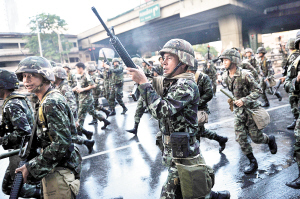 在泰國總理阿披實(shí)12日宣布曼谷和周邊5府部分地區(qū)進(jìn)入緊急狀態(tài)后,泰國軍隊(duì)和警察開始在重要路段部署兵力。13日凌晨4時(shí)30分,數(shù)百名士兵在丁當(dāng)?shù)貐^(qū)采取的驅(qū)散行動(dòng)中與示威者發(fā)生嚴(yán)重沖突。阿披實(shí)說,約70人在沖突中受傷,其中23人為士兵,大部分為催淚彈所傷,無人喪生。