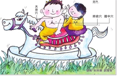 北京軍區(qū)總醫(yī)院藥劑科謝予朋博士介紹說(shuō),天突穴在胸骨上窩中央,按摩這個(gè)穴位可以緩解咳嗽、氣喘、咽喉腫痛等癥狀;膻中穴在體前正中線,兩乳頭中間,按摩這個(gè)穴位可以緩解胸悶、咳喘、吐逆等癥狀;肺俞穴則位于人體的背部,當(dāng)?shù)谌刈导幌,左右旁開(kāi)二指寬處,按摩這個(gè)部位可以治療呼吸道疾病。