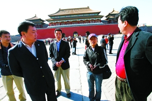 北京市旅游局副局長于德斌(左2)帶隊(duì)檢查旅游市場時(shí),一名婦女(右2)上前向他自薦黑導(dǎo)游。昨日,北京市旅游局聯(lián)合城管、治安總隊(duì)等到故宮檢查無證導(dǎo)游帶團(tuán)現(xiàn)象。由于都是便裝,執(zhí)法人員還沒走到太和殿,一名無證女導(dǎo)游就迎了上來,詢問是否需要導(dǎo)游。執(zhí)法員隨后表明身份,要求她到指定地點(diǎn)接受處理。本報(bào)記者 吳江 傅沙沙 攝影報(bào)道