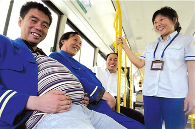 昨天上午,在北京站東街的639公交車總站內(nèi),突然多了很多“孕婦”集中乘車。為迎接母親節(jié)的到來,車隊讓男司乘人員假扮孕婦,體驗當母親的辛苦。