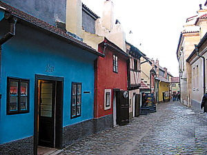 從修道院通往城堡的小街居然就是著名的黃金小巷。這巷子的出名其實是因為卡夫卡曾經(jīng)住在這里,并完成了我們熟悉的小說《城堡》。黃金巷是一條由磚石鋪成的街道,街道很窄,原是皇室仆役聚居的處所,后來這里聚集了很多煉金術(shù)師,黃金巷由此得名。