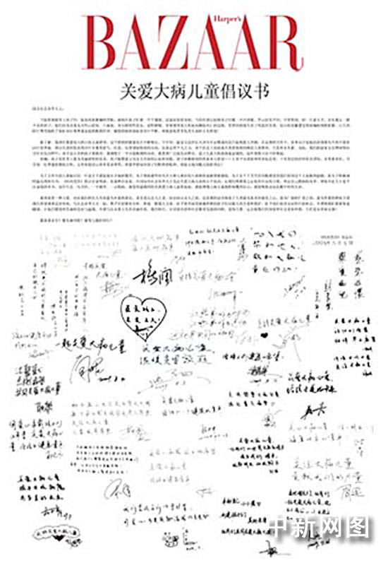 中新網(wǎng)8月10日電 今日,時(shí)尚雜志《時(shí)尚芭莎》攜手百位明星、名流和企業(yè)家發(fā)起聯(lián)名倡議,呼吁政府相關(guān)部門、各級慈善公益組織,共同關(guān)注中國大病兒童這一弱勢群體的生存、救助問題。同時(shí),《時(shí)尚芭莎》宣布將于9月底在京舉行,本屆活動募集的所有善款都將全部捐助給國內(nèi)大病兒童救助公益事業(yè),以此慈善盛舉向偉大祖國六十華誕獻(xiàn)禮。