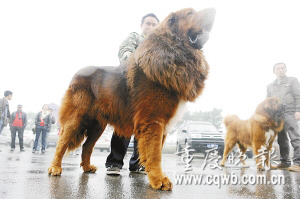 “這是國內(nèi)目前毛色最好,體形最漂亮,售價最高的藏獒。”王平介紹說,紅棕色藏獒號稱是西藏活佛的護衛(wèi),是藏獒中最名貴的品種,廣東一個房地產(chǎn)老板曾經(jīng)出價750萬元人民幣,外加一輛寶馬汽車,總價值大約800萬元購買,但仍然被王平拒絕了。