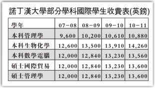 諾丁漢大學(xué)位于英國中部。由于近幾年與中國多所院校合作辦學(xué),中國留學(xué)生成批涌進(jìn)這所大學(xué);同時(shí)該校還在浙江寧波設(shè)立分校,有條件的大三學(xué)生會(huì)到英國讀書一年。記者聯(lián)系到該校的碩士研究生陳兵同學(xué),他詳細(xì)列出該校歷年來的收費(fèi)標(biāo)準(zhǔn)。今年的學(xué)費(fèi)比去年略有上漲,但增長率與往年持平。他覺得這個(gè)上調(diào)的價(jià)格是合理的,中國來的同學(xué)都能接受。