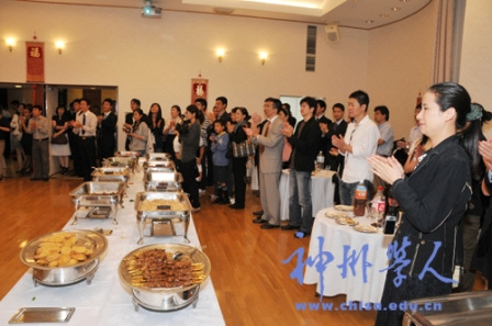 招待會上,留學(xué)人員載歌載舞表達(dá)著對祖國的祝福,每個人都沉浸在國慶佳節(jié)的氣氛中,大家品嘗著美味佳肴,談?wù)撝鎳陌l(fā)展變化,構(gòu)思著自己的美好未來。祖國的明天更美好——這是大家共同的心愿。