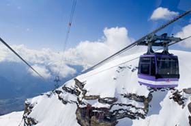 我總有點(diǎn)狹隘地認(rèn)為外國(guó)人都有點(diǎn)“似乎瘋狂”,一逮著點(diǎn)時(shí)間就去登山、滑雪。從山下徒步登上山頂?shù)倪@股累暫且不提,爬上山后再?gòu)母吒叩膽已绿氯ィ抛约旱幕┘夹g(shù)的這股勇氣真是可歌可泣,像我這樣缺少膽量的人自然是不能做此類瘋狂之事,可是面對(duì)皚皚白雪和巍巍高山總是心有不甘,而連接雪山的纜車則正好可以滿足我不費(fèi)吹灰之力也可飽覽群山的愿望。