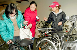 在服務(wù)項目的啟動儀式上,14名分別來自中國、越南和印度尼西亞的留學(xué)生來到活動現(xiàn)場。平和文化中心的工作人員們在啟動儀式上搞了個別出心裁的游戲,特意請這些留學(xué)生們從事先準備好的30輛自行車中,分別按照型號和顏色各選出一輛最受歡迎的車。