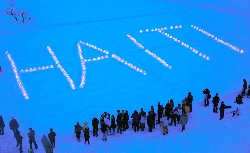 這次祝福祈愿燭火會是由國際大學的留學生會組織的。大家在校園內(nèi)的一塊空曠的雪地上用點燃的蠟燭拼寫出一個大大的“HAITI”,并一起為在海地大地震中遭遇不幸的人們祈禱祝福,追悼亡靈。
