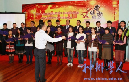 隨后,聯(lián)歡晚會(huì)在《我和我的祖國》的歌聲中拉開了序幕。留學(xué)生們和使館工作人員獻(xiàn)上了形式多樣的節(jié)目:舞蹈《蒙古舞》、《金梭和銀梭》,小品《吃面》、《賣拐》,男聲獨(dú)唱《故鄉(xiāng)的云》,女聲獨(dú)唱《父老鄉(xiāng)親》,配樂詩朗誦《致橡樹》等等。精彩紛呈的表演時(shí)時(shí)引來熱烈的掌聲和喝彩聲,會(huì)場上始終洋溢著歡樂祥和的節(jié)日氣氛。