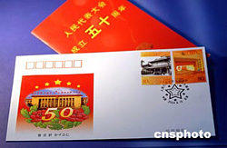 中華人民共和國第一屆全國人民代表大會第一次會議于1954年9月15日在北京召開,北京市郵票公司為配合國家郵政局于9月15日發(fā)行《人民代表大會成立五十周年》紀念郵票(1套2枚),特設(shè)計印制了該郵票的首日封(下)、郵折(上)等郵品,將與郵票同日發(fā)行。這套郵票的名稱分別為:一屆全國人大一次會議在中南海懷仁堂舉行,莊嚴的人民大會堂主席臺。兩枚郵票的面值均為80分。中新社記者:鄒憲