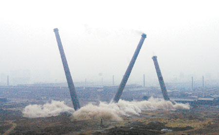 明天是2005年3月23日,原沈陽冶煉廠的3根百米煙囪拆除一周年;將日歷回翻365頁,2004年3月23日凌晨6點,在許多老工人留戀的目光中,在全國各地的注目下,沈陽老工業(yè)基地的標志性建筑原沈陽冶煉廠的3座百米煙囪轟然倒地。