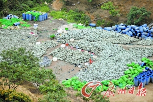 近日,有熱心讀者致電廣州日報稱一個地下金屬回收廠藏身于布吉南灣一處山坳里,留意觀察才發(fā)現里面的人用明火和強酸提煉各種金屬,近百桶裝滿各種腐蝕性、強酸性的化學品就堆放在一個雨棚下面,對周邊環(huán)境危害很大。1月25日上午,記者驅車從吉廈工業(yè)園內經過一段崎嶇不平的山路,才在一處山坳里找到這處極其隱蔽的地下金屬回收廠。