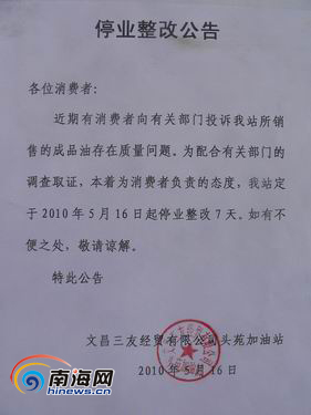 史老板說,5月18日下午他接到相關(guān)部門出具的檢測(cè)結(jié)果,對(duì)此結(jié)果他沒有異議.在19日中午文昌工商局對(duì)他的加油站進(jìn)行整改,目前處于停業(yè)整改期。