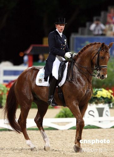 八月十九日晚,在香港沙田奧運(yùn)馬術(shù)盛裝舞步個(gè)人賽(大獎(jiǎng)賽自選動(dòng)作)上,德國(guó)選手?恕た四瑺柅@銅牌。 中新社發(fā) 洪少葵 攝