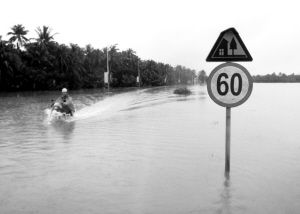瓊海嘉積鎮(zhèn)多條道路遭受內(nèi)澇。17日下午2時許,南國都市報記者徒步趟過3公里積水路段,來到上次受災(zāi)嚴(yán)重的嘉積鎮(zhèn)橋頭村委會。該村委會通往嘉積的兩條道路豪華路、嘉博路部分路段積水超過1米。如果不是路邊豎立的路燈,很難分清哪里是道路,哪里是路邊水田。