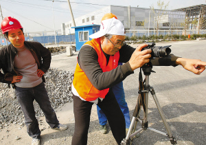 趁著工人們吃飯午休的時(shí)間,王建平和志愿者羅炳炎、周燕棣來(lái)到世博主題館工地:取景、選角度、架三腳架……一陣忙碌,世博工地上就有了一處露天“攝影棚”。提前一天接到通知的工人們,剛放下手中的活就跑到攝影師前,擺起了各種姿勢(shì)。