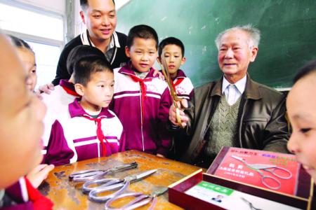 “同學(xué)們會(huì)不會(huì)說(shuō)福州話。俊备V蓦娨暸_(tái)《攀講》節(jié)目主持人“土豆”發(fā)問(wèn)了!拔視(huì)!我會(huì)!”孩子們的情緒馬上高漲了起來(lái),紛紛舉手,表示自己是個(gè)小小福州人!罢l(shuí)知道我們福州的傳統(tǒng)手工藝有哪些?今天,我們給大家介紹三位傳統(tǒng)手工藝的傳人,首先是剪刀狀元!”在孩子們的掌聲中,“鄭興利”剪刀的第三代傳人鄭德官走上講臺(tái),八十高齡的他首先拿起一把剪刀,為孩子們講起有關(guān)“福剪”的往事。同學(xué)們被新奇的故事吸引了。鄭老又拿出幾把自己生產(chǎn)的特色剪刀,有的剪刀頭鑄成圓弧狀防止傷人,有的剪刀小巧可愛(ài),有一把剪刀做成了一只仙鶴的形狀。
