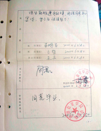 學(xué)籍登記表上寫著“同意畢業(yè)”