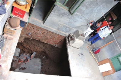 昨天上午,記者在現(xiàn)場看到,這處塌陷坑位于院子的東北側,上面一塊長近3米、寬近2米的石板整體隨之塌了下去。從坑內可以看得到房子的地基。