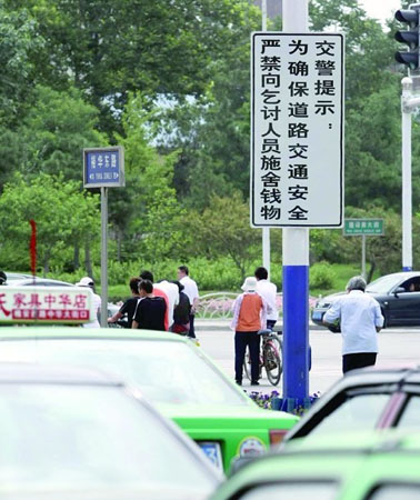 近來(lái),在省城石家莊“迎賓大道”裕華路與建設(shè)大街交叉口,交管部門(mén)豎起的兩塊“新式”交通警示牌引發(fā)市民議論!盀榇_保道路交通安全,嚴(yán)禁向乞討人員施舍錢(qián)物”的警示語(yǔ)赫然入目,對(duì)此,記者在采訪中也聽(tīng)到了社會(huì)各界的一些不同看法。