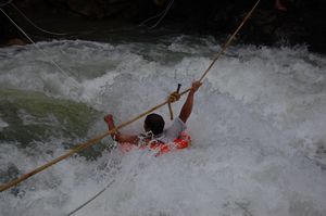 根據(jù)現(xiàn)場情況,救援人員迅速在被困男子上空架起一條空中繩索 一名熟悉水性的戰(zhàn)士攜帶安全繩,救生衣等救援裝備采用空中橫渡的方式到達被困人員上方。救援戰(zhàn)士首先嵌入水中將安全繩系在男子腰上,再將男子向上托起,使被困男子脫離石縫。最后在岸上救援人員一齊拉動安全繩。下午2時30分左右,最后一名落水男子被成功救援上岸,并迅速被送往醫(yī)院搶救。