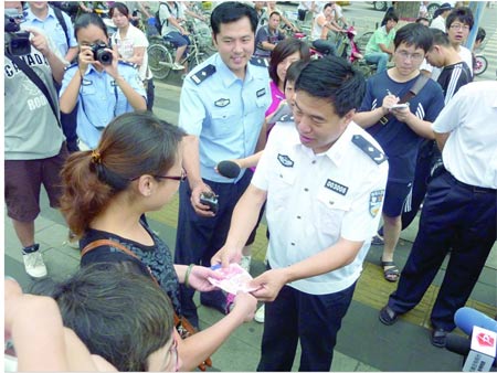 7月10日的活動于早8時(shí)開始。在中山路與建設(shè)大街交叉口,石家莊市委宣傳部副部長、省會文明辦主任薛建廷,石家莊市公安局副局長、市公安交管局局長武瑞琪分別將500元獎(jiǎng)金發(fā)給第一位不闖紅燈的非機(jī)動車騎乘人王秀山和不闖紅燈的行人郝召云;在中山路與維明街交叉口,市委宣傳部常務(wù)副部長王惠周,市公安交管局副局長金永安分別將500元獎(jiǎng)金發(fā)給第一位不闖紅燈的行人杜彥坤和第一位不闖紅燈的非機(jī)動車騎乘人鄭立剛;在中山路與青園街交叉口,省會文明辦副主任申學(xué)啟,市公安交管局局長助理、設(shè)施大隊(duì)大隊(duì)長李春光分別將500元獎(jiǎng)金發(fā)給第一位不闖紅燈的行人陸運(yùn)清和第一位不闖紅燈的非機(jī)動車騎乘人劉建英。
