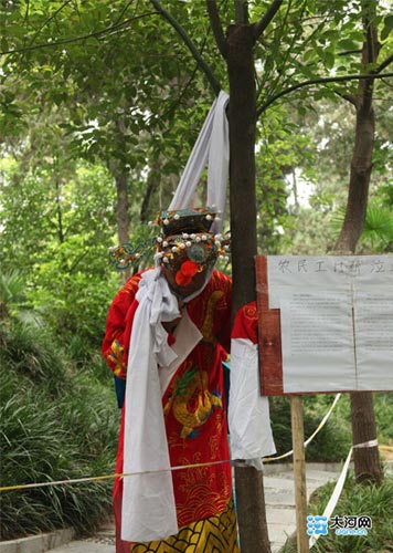 包工頭為農(nóng)民工討薪 公園內(nèi)扮財(cái)神爺“上吊”(圖)